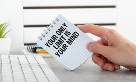 A close-up shot of a spiral-bound notebook open to a page with the words Your Only Limit Is Your Mind clearly written