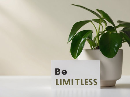 AI Generated. note that says be limitless with vibrant green plant glossy leaves on simple background copy space