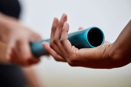 Take it and run. two athletes passing a baton during a relay race.