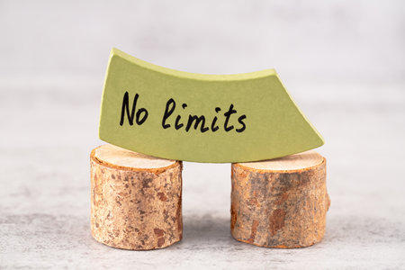 No limits words on the green wooden board on two brown wooden stands on the gray background. No limits as a motivation for success.
