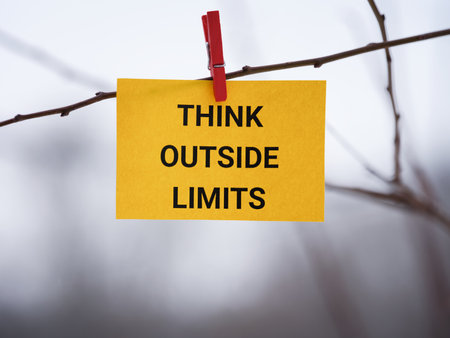 A yellow paper note with the phrase Think Outside Limits on it attached to a tree with a clothes pin. Close up.