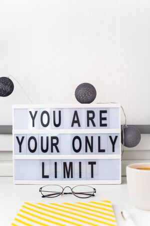 You are your only limit framed in a modern workplace with a notebook and a lamp. Motivation for work and achievements. Freelance Concept