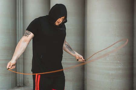 Caucasian man fighter training hard in the outdoors.. Man using rope, making warm up. concept about sport and boxing