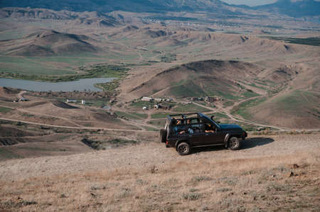 Republic of Crimea, Russia - August 24, 2021: SUV jeep with tourists goes to mountains for an excursion in summer