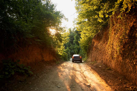 Travel by car on a dirt road, Sunny sunset light
