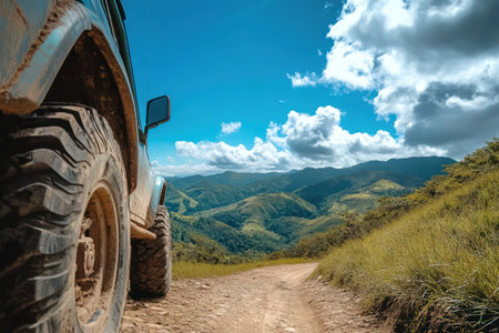 off-road vehicle in the middle of a challenging off-road trail with stunning scenery, created with generative ai
