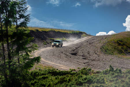 Off-road car riding on mountain road in Carpatians on summer day