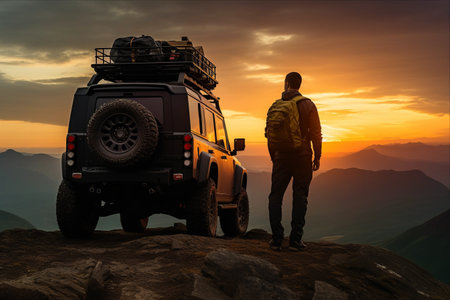 Sunset Serenade: An Adventurous Hiker Explores the Mountains with his All-Terrain SUV