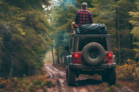 Man in a 4x4 driving on a muddy forest trail, showcasing the thrill of offroad exploration amidst serene natural surroundings