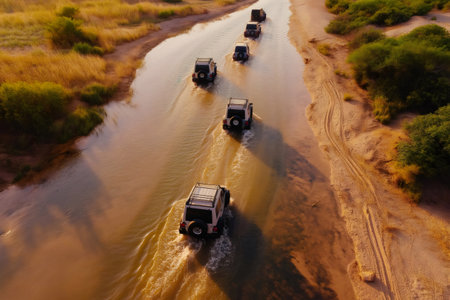 Aerial view of a convoy of jeeps crossing a shallow river in a wild landscape, creating a sense of adventure and exploration