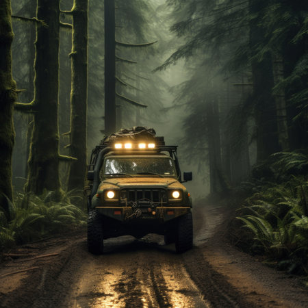 An AI generated illustration of SUV driving on a dirt road in a misty forest