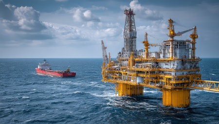 An oil rig stands tall and industrial in the vast expanse of the ocean. The rig is extracting oil from beneath the sea floor, while workers move around the structure, maintaining and operating machinery.