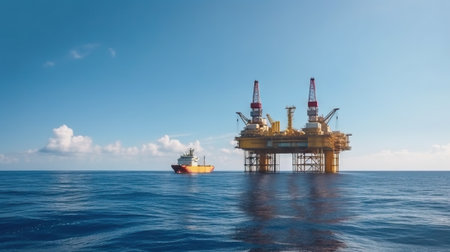 An offshore oil rig platform with cranes and supply ship on calm ocean under blue sky with clouds