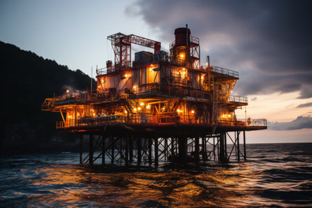 A large, illuminated offshore oil rig stands tall in the water at dusk. The rig's lights cast a warm glow against the darkening sky, while the platform's silhouette is framed by the rippling water. AI
