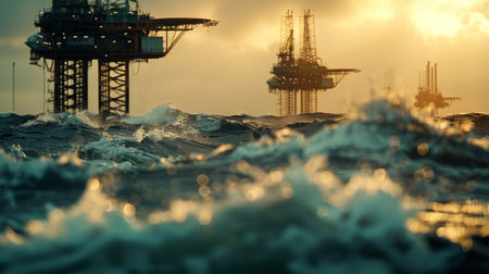 Captivating sunset scene featuring oil rigs silhouetted against the colorful sky over calm ocean waters, showcasing the blend of industry and nature.