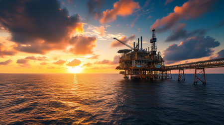 A striking scene depicts a massive offshore oil rig silhouetted against a breathtaking sunset sky The colossal industrial structure stands tall its intricate framework and machinery a testament to