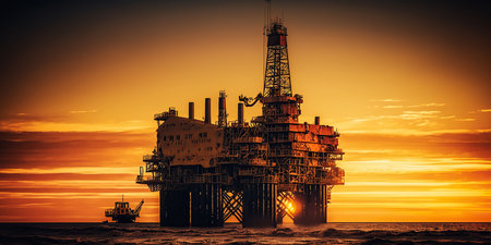 Offshore oil and rig platform in sunset or sunrise time, Construction of production process in the sea, Power energy of the world, Ai generated.
