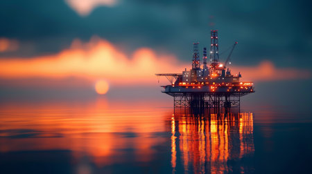 A stunning oil platform at sunset, showcasing intricate structures and glowing lights over ocean
