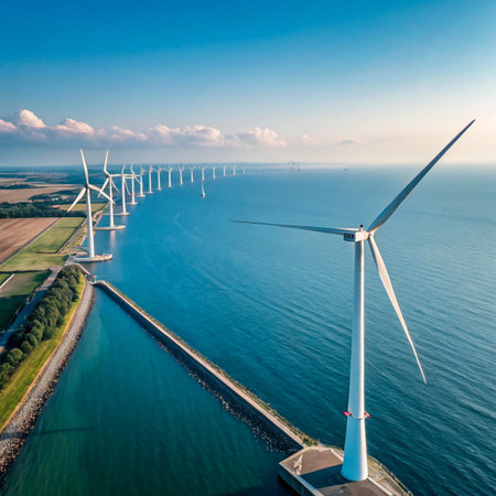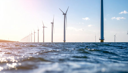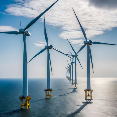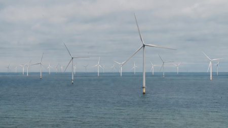 A vast offshore wind farm stretches across the ocean, with turbines generating clean energy under a clear, sunny sky.