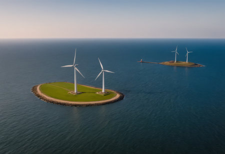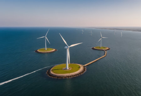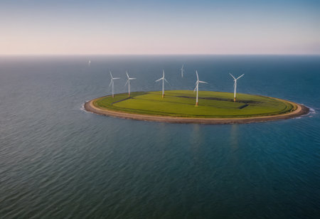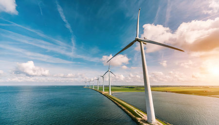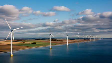 Aerial view of wind turbines in a coastal area, harnessing the strong ocean winds to generate electricity for nearby communities.