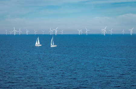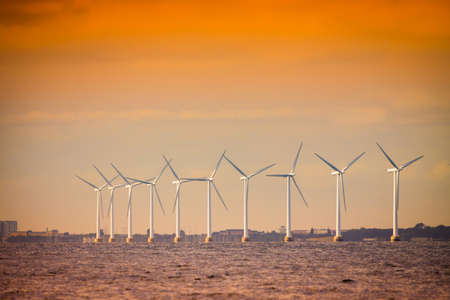 Wind turbines generator farm for renewable sustainable and alternative energy production along coast baltic sea near Denmark. Eco power, ecology.