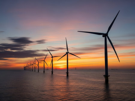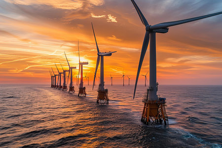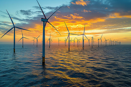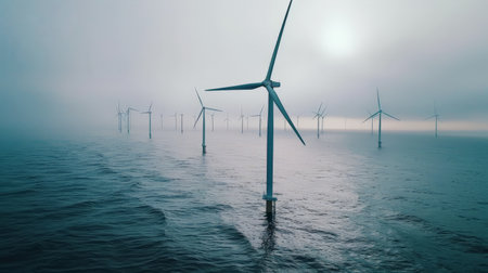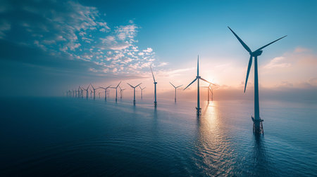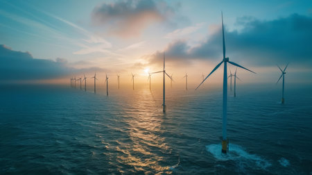 Rows of offshore wind turbines harnessing renewable energy in the early morning light, symbolizing sustainable and eco-friendly power generation.