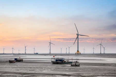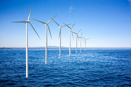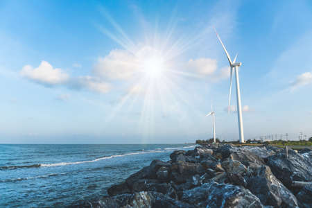 Wind turbines farm on the sea is an alternative electricity source, Concept of sustainable resources, Sunlight in summer with wind generators turbines, Renewable energy concept.