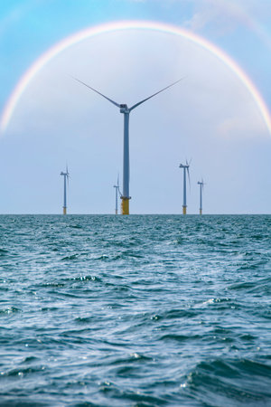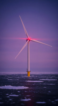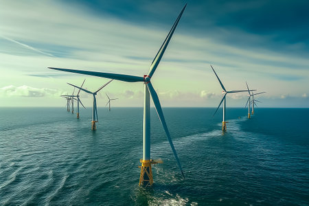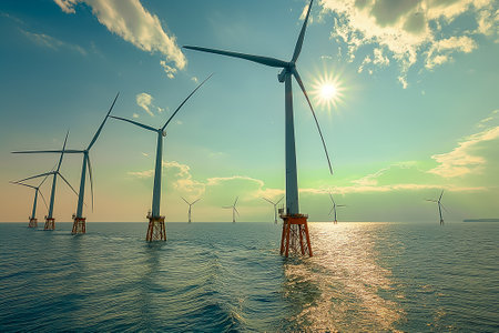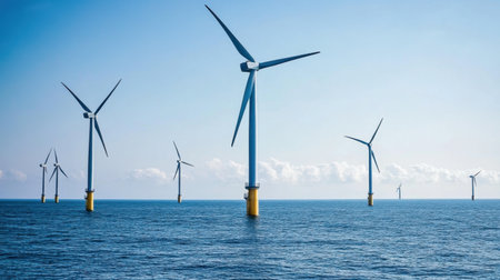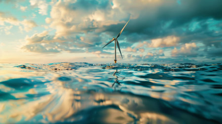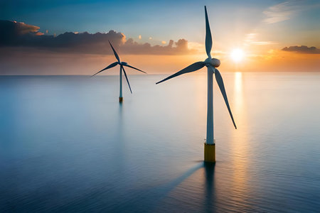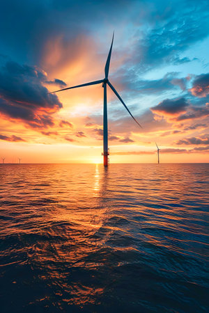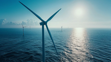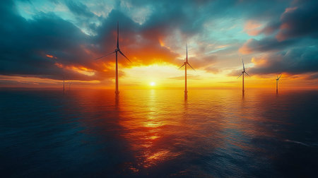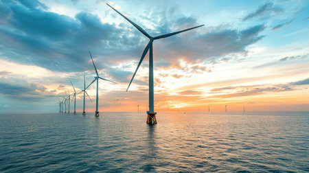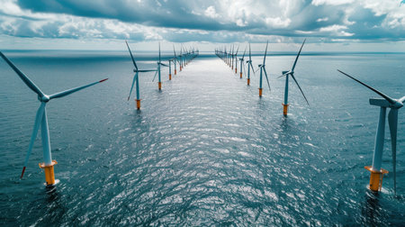 Breathtaking view of offshore wind turbines standing tall in the ocean. The image showcases sustainable energy solutions harnessing wind power for a cleaner future.