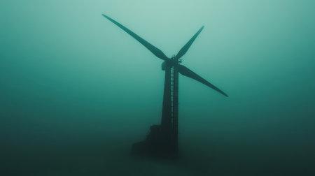 This captivating image features a wind turbine emerging from a thick mist, creating a mysterious yet serene atmosphere over calm water. The silhouette against soft light captures the essence of renewable energy and natural beauty.