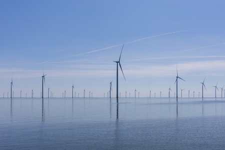 Offshore wind farm with wind turbines in the Netherlands. Modern sustainable energy, calm water with reflections and clear morning sky.