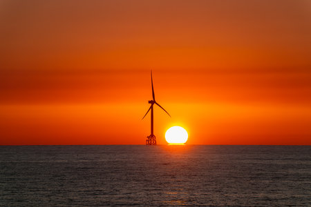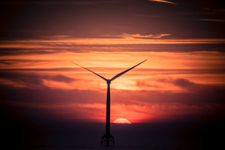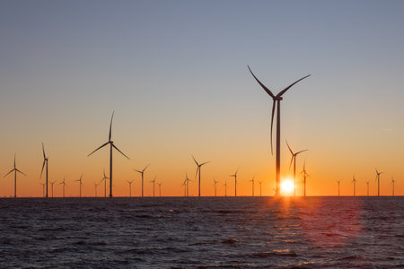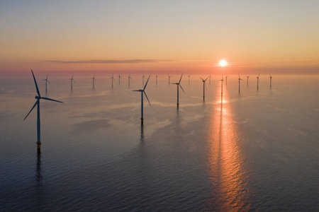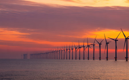 Wind showing offshore wind farm turbines silhouetted against a vibrant orange and purple sunset sky energy. High resolution image suitable for commercial use. Clear details and vibrant colors enhance visual appeal.