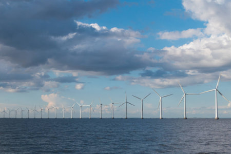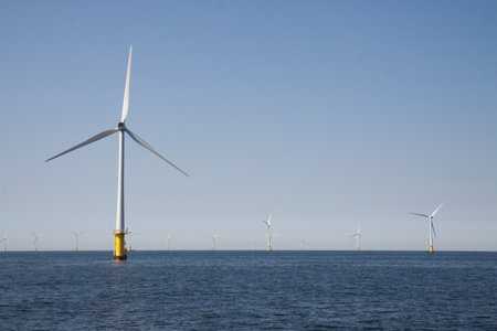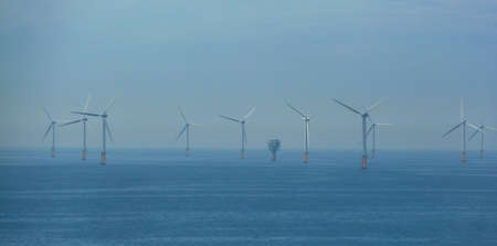 Wind turbines in an offshore wind farm in the North Sea just off the coast of the Netherlands, on a clear day.