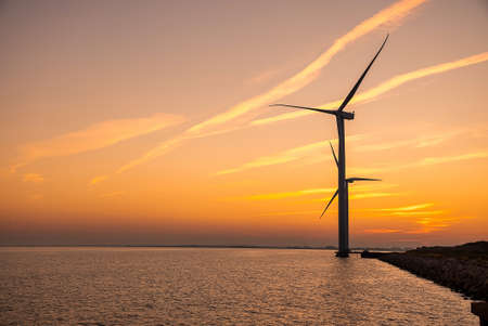 Offshore Windmill for electric power production at beautiful sunset in the sea.