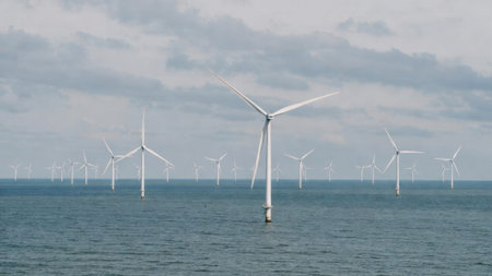Offshore wind farm with turbines generating renewable energy on a cloudy day.