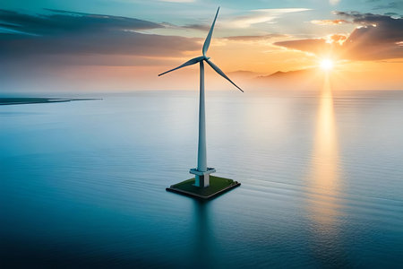 A majestic summer sunset as the sun descends behind a towering wind turbine on the coastline, symbolizing clean energy and nature.