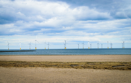 Wind turbines at sea. Offshore wind power farm in the North Sea.