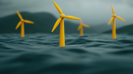 Vivid yellow wind turbines rise from dark, turbulent ocean waves, set against an ominous cloudy sky, symbolizing renewable energy innovation.