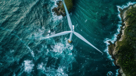 Stunning aerial shot of offshore wind turbines harnessing renewable energy, showcasing a sustainable future with a backdrop of the clear blue ocean