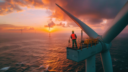 Engineer stands on platform on wind turbine top in sea at sunset, worker performs maintenance of windmill in ocean. Concept of energy, power, sustainable development, landscape. Generative AI