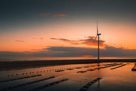 The reflection of a turbine on wet ground at sunset in the background in Neeltje Jans, Netherlands