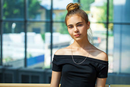 Closeup portrait of Caucasian young beautiful woman model with messy long hair in striped t-shirt by window indoor showing one bare shoulder, toned with filters