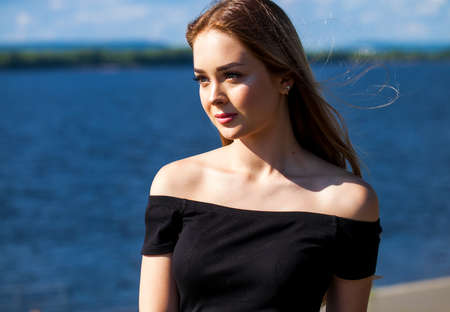 Stylish young woman with long hair, free space. Beautiful girl near the river.
