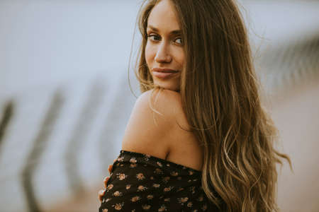 Portrait of a beautiful young woman on the beach at sunset.