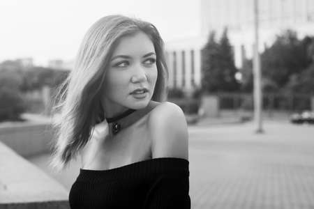 Portrait of beautiful young brunette girl in black dress. Fashion photo