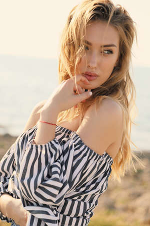 fashion outdoor photo of beautiful girl with blond hair in elegant clothes posing at summer sunset beach