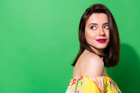 Profile photo of adorable elegant person look interested empty space isolated on green color background