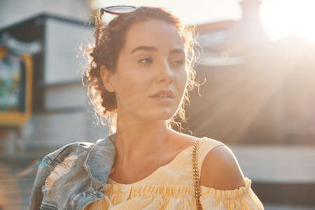Young woman face in sunlight, portrait. Atmospheric photo.