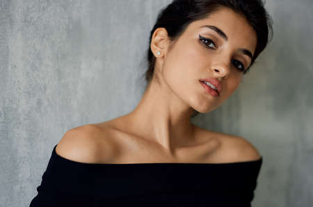Attractive woman in black dress with open shoulders