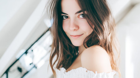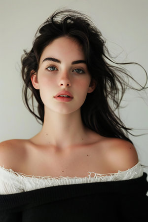 Stylish woman with wavy hair wearing an off-shoulder blouse, looking confidently at the camera in a soft, minimalistic setting.