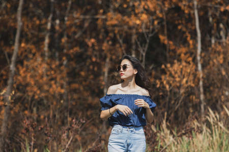 beautiful asian younger woman standing aginst dry leaves forest